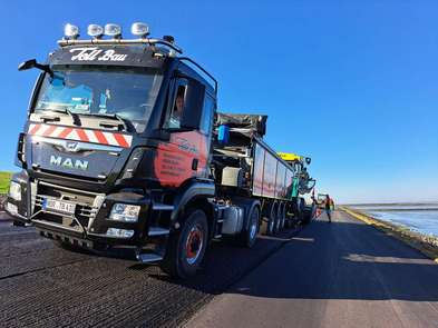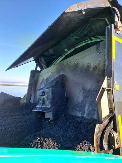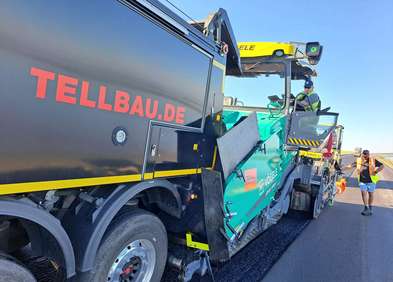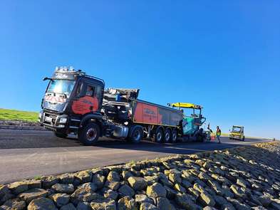 Die Neigung stellt nicht nur eine Herausforderung für den Fahrzeugtransport zur Baustelle dar, sondern auch für den Asphalteinbau. Besondere Vorkehrungen sind nötig, um das Mischgut am Überlaufen zu hindern. Zur Anlieferung des Asphaltmischguts werden spezielle Thermomulden mit Abschiebetechnik von Fliegl – genannt ASW Asphalt Profi-Thermo - eingesetzt, da herkömmliche Kipplaster hier aufgrund der Schräge umkippen würden. Diese Technologie gewährleistet, dass das Asphaltmischgut schichtweise in den Fertiger fällt, wodurch eine gleichmäßigere Mischguttemperatur erreicht wird. „Bei einem normalen Kipper läge der Schwerpunkt zu hoch. Der würde hier in der Schräge auf die Seite fallen“, erläutert Kilian Efen. Tell Bau setzt die Abschiebetechnik allerdings auch auf Baustellen zu ebener Erde ein. „Das Asphaltmischgut fällt schichtenweise in den Fertiger. Dadurch haben wir keine Entmischung und auch eine gleichmäßigere Mischguttemperatur“, sagt Efen. „Das fällt bei warmem Wetter wie heute weniger ins Gewicht, aber es kann hier im Norden schon ziemlich kalt und windig werden.“