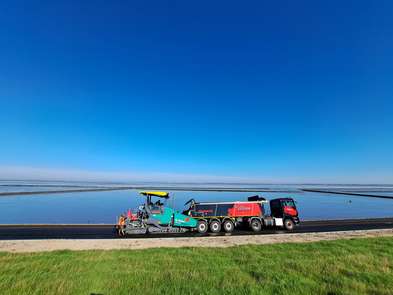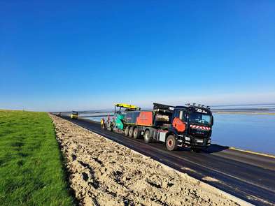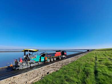 Der Einbautrupp auf der Baustelle arbeitet effizient und bringt täglich etwa 1500 Tonnen neuen Asphalt auf das Deckwerk auf. Die Arbeit auf dieser Deichbaustelle bietet nicht nur Meerblick, sondern auch eine ruhige und angenehme Arbeitsumgebung. Das erneuerte Asphaltdeckwerk wird dazu beitragen, dass die Schutzfunktion des Deichs in Norddeich auch in den nächsten Jahrzehnten gewährleistet ist.