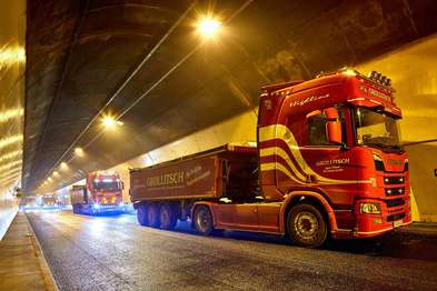 Ein weiterer Einsatz des Thermoabschiebers führt nach Traun in Oberösterreich. Hier soll ein Tunnel mit Hilfe von acht dieser Fahrzeuge asphaltiert werden. Neben dem qualitativen Vorteil ergibt sich bei dieser Situation ein weiterer Nutzen. Denn der Thermoabschieber ist eine intelligente Lösung bei schwierigen Einbausituationen wie beim gegebenen Einsatz. Mit seiner bewährten Abschiebetechnik benötigt er beim Abladen keinen Kippwinkel. Daher perfekt und dringend nötig für arbeiten im Tunnel. Abzuschieben statt zu kippen bedeutet außerdem mehr Sicherheit - wo nicht gekippt wird, kann nichts umkippen.