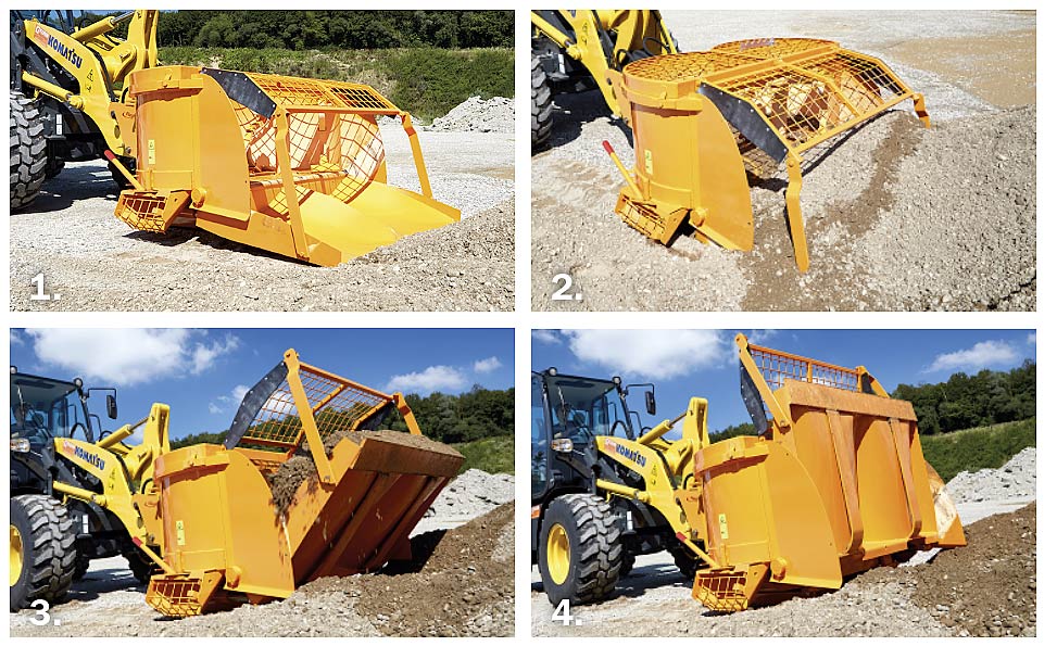 Einfach in den Kies, Schotterhaufen etc. einfahren,die Schaufel schließen und die Zusatzkomponenten hinzugeben